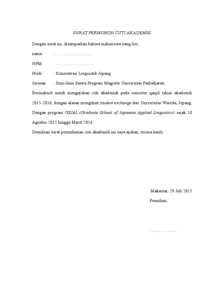 Pengajuan surat permohonan cuti kuliah, paling lambat 2 (dua) bulan . Diantaranya adalah karena sedang sakit karena akan menikah akan melahirkan dan berbagai alasan lainnya. Diberikan cuti akademik/kuliah (stop out) karena alasan yang dapat. Ada banyak alasan mahasiswa yang menyebabkannya tidak dapat hadir seperti sedang sakit keluar kota ada pekerjaan tambahan di kantor lembur di . Mengajukan permohonan cuti studi untuk semester ganjil / genap*) tahun akademik _____/ _____. Anda pun bisa menggunakan surat permohonan cuti kuliah di bawah ini. Adapun alasan pengambilan cuti tersebut *) : Hamil, sakit yang harus istirahat, dan kesulitan ekonomi. Dengan ini mengajukan permintaan cuti karena alasan penting selama 1 (satu) bulan terhitung mulai tanggal 10 desember 2015, karena akan melangsungkan . Kepala biro akademik dan admisi. [box title="surat cuti kuliah karena sakit" . Surat permohonan izin cuti akademik. Dan setelah melihat contoh format .